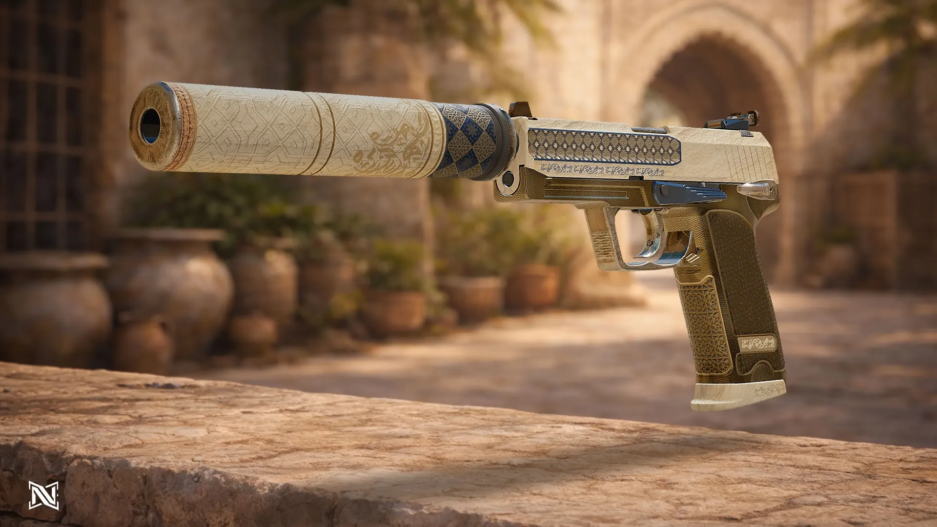 Desert golden glamour in the most compact format. The body mimics weathered sandstone with the finest carving in the style of North African mosques and medinas. Restrained blue geometric motifs add depth and catch sunlight, creating an illusion of volume and antiquity. The texture is so tactile it almost feels like your fingers can sense the roughness of the stone. This is the perfect “quietly expensive” skin for an Arabian collection — elegant, luxurious, without loud colors. In Factory New condition it will gleam in the sun on Dust II and Mirage like a genuine treasure from a forgotten palace.