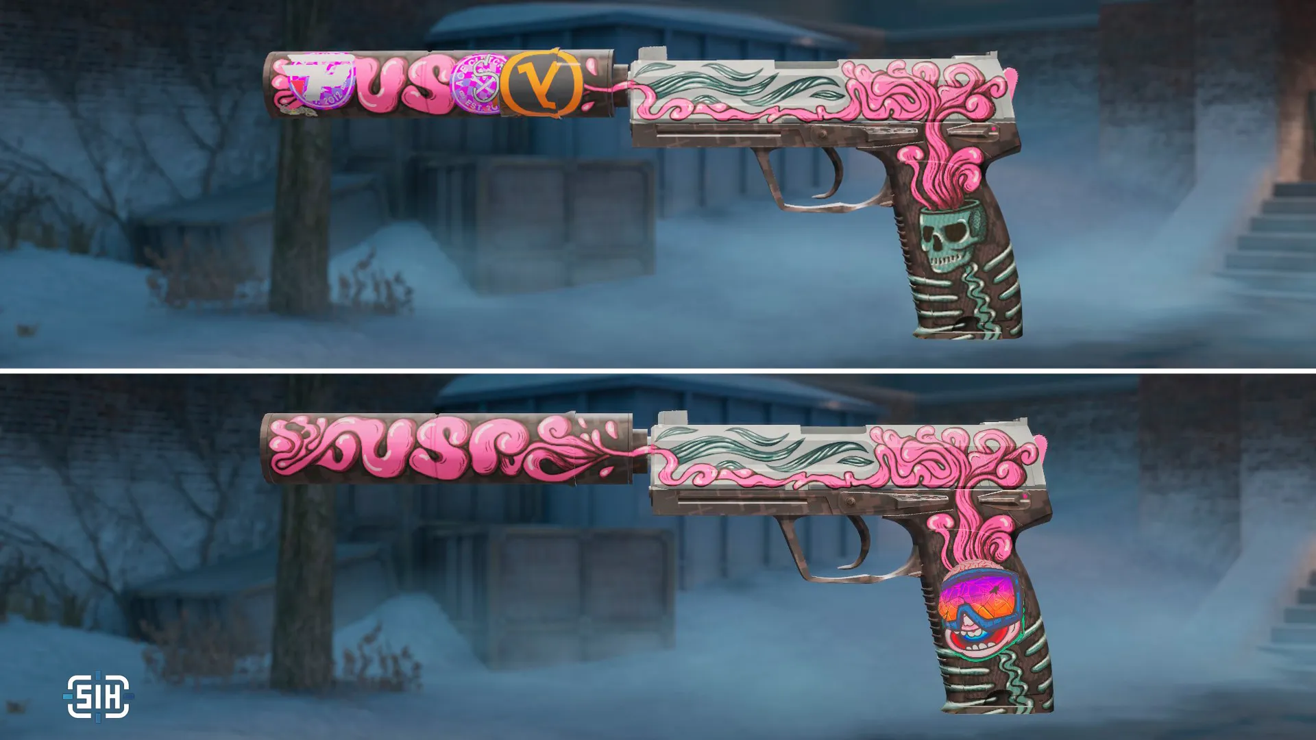 Another legend that changed its appearance long before the transition to CS2 and the new engine. As you remember, stickers used to be placed exclusively in fixed positions on the body, and one of the four available options was located right on the skull image. Many stickers were placed in this spot, and even such a small change was considered very original and valued in the community. Now this skin is still upgraded in a similar place, but also has quite a few upgrade options on the slide and suppressor.
