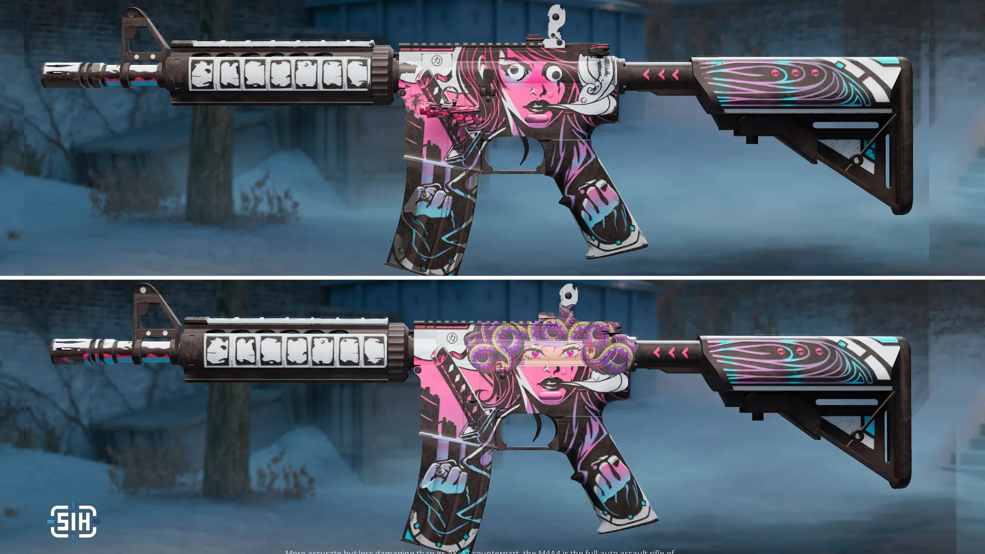 The famous collection featuring long-haired girls, but it’s the main character of the M4A4 who has become a regular at makeup artists and stylists. Sometimes they emphasize her noir vibes, sometimes make her a bit “wild,” and in some cases transform her into Medusa Gorgon. All these images truly transform her original appearance and focus attention only on her image, forgetting about the rest of the weapon.