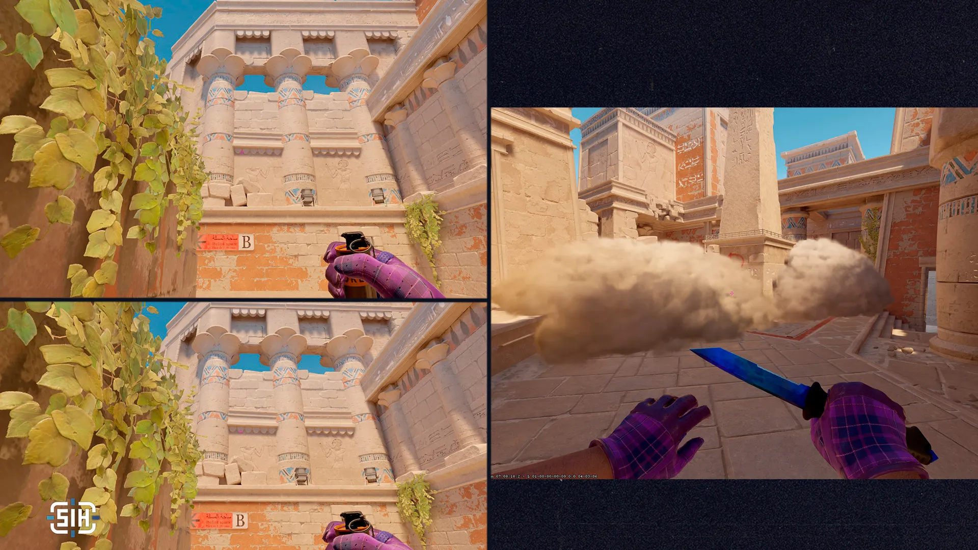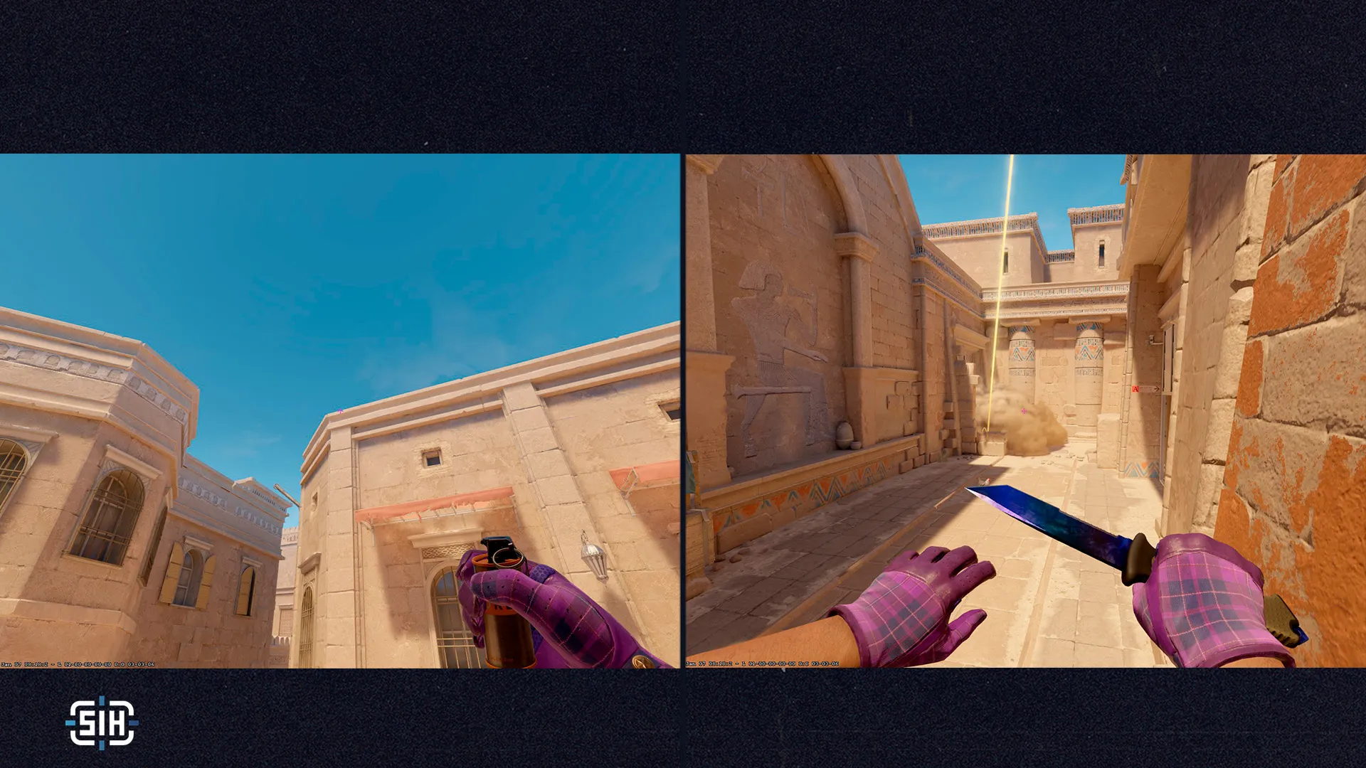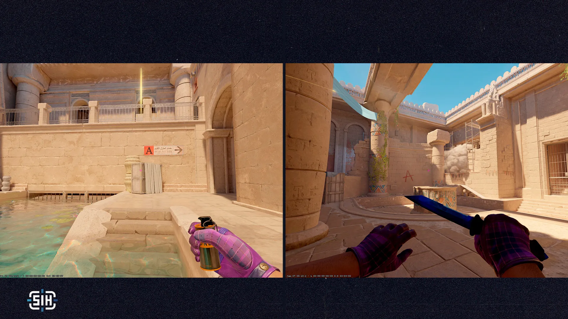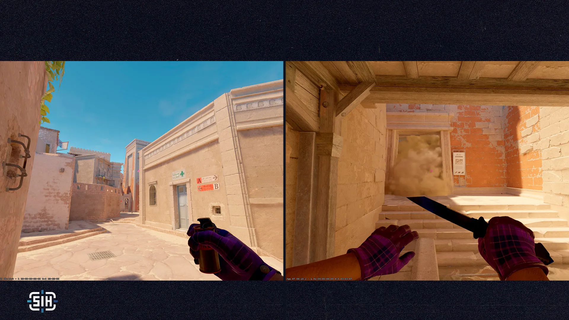 Просим товарища по команде скинуть вам дым в угол напротив этих коллон и целимся как показано на скриншотах. Оба дыма бросаются с прыжка и приземляются довольно быстро, благодоря отскоку от выступающих текстур. Дымы крайне стабильные, простые и позволяют полность отрезать хелпу с CT-спавна. Единственные позиции, которые нужно прочекать при заходе – это упор и коннектор. Не забывайте, про механику развеевания смоков и занимайте более сейвовые позиции при обороне поставленной бомбы.