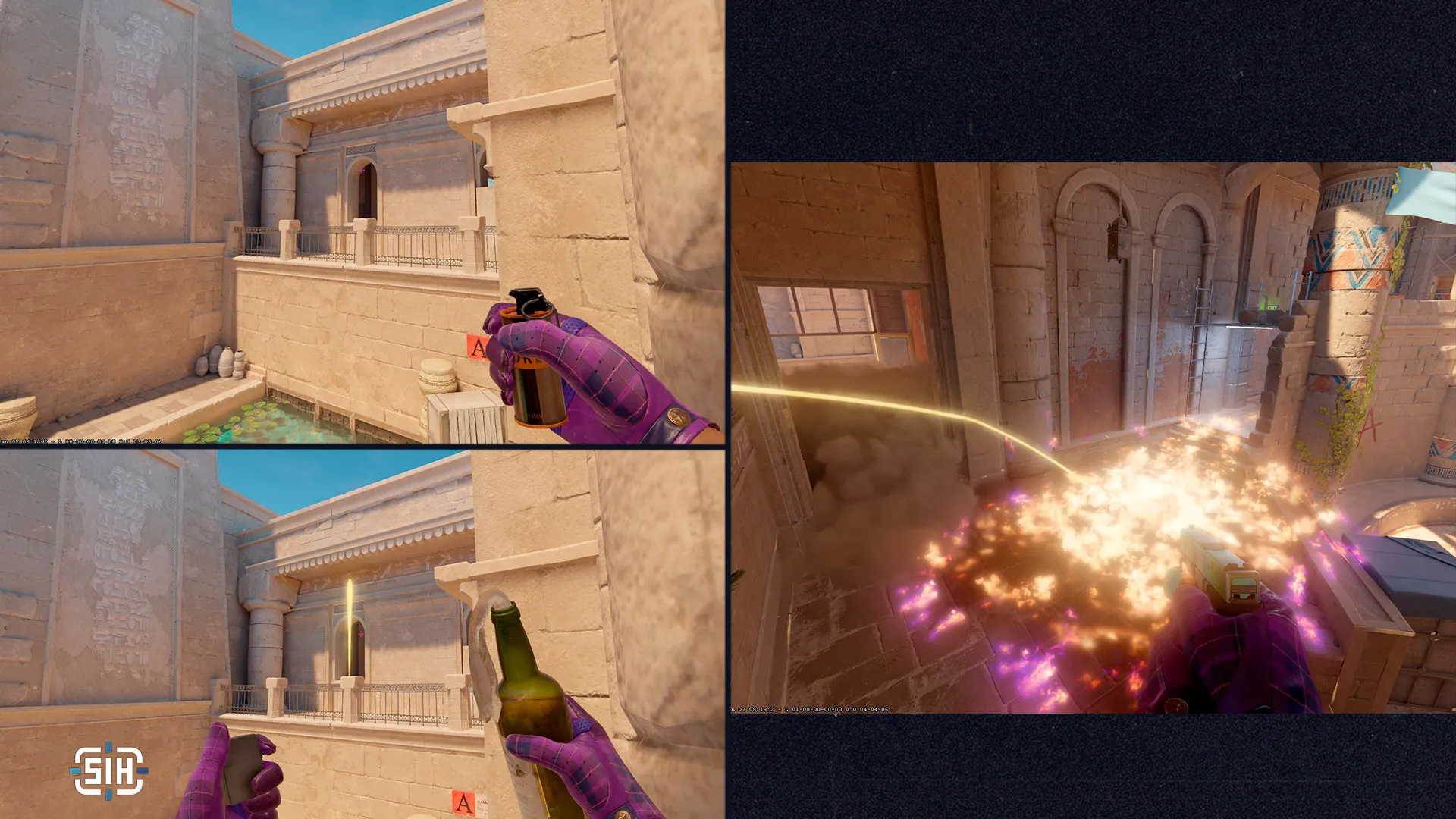 Упираетесь в угол “тупика”, находите напротив ящик и целитесь посредине верхней части угла. Гранаты бросаются в прыжке – дым падает на “девятку”, а флэшки слепят весь плент при этом не мешая союзникам заходить на точку. Можно использовать как в атаке, так и ретейке за защиту. Лучше всего использовать в комбинации с предыдущими гранатами (смок и молотов на Heaven). Небольшой лайфхак для новичков: чтобы бесшумно спуститься с ковров на воду достаточно просто пройти все текстуры с зажатой клавишей Shift (не спрыгивайте, просто двигайтесь вперёд).