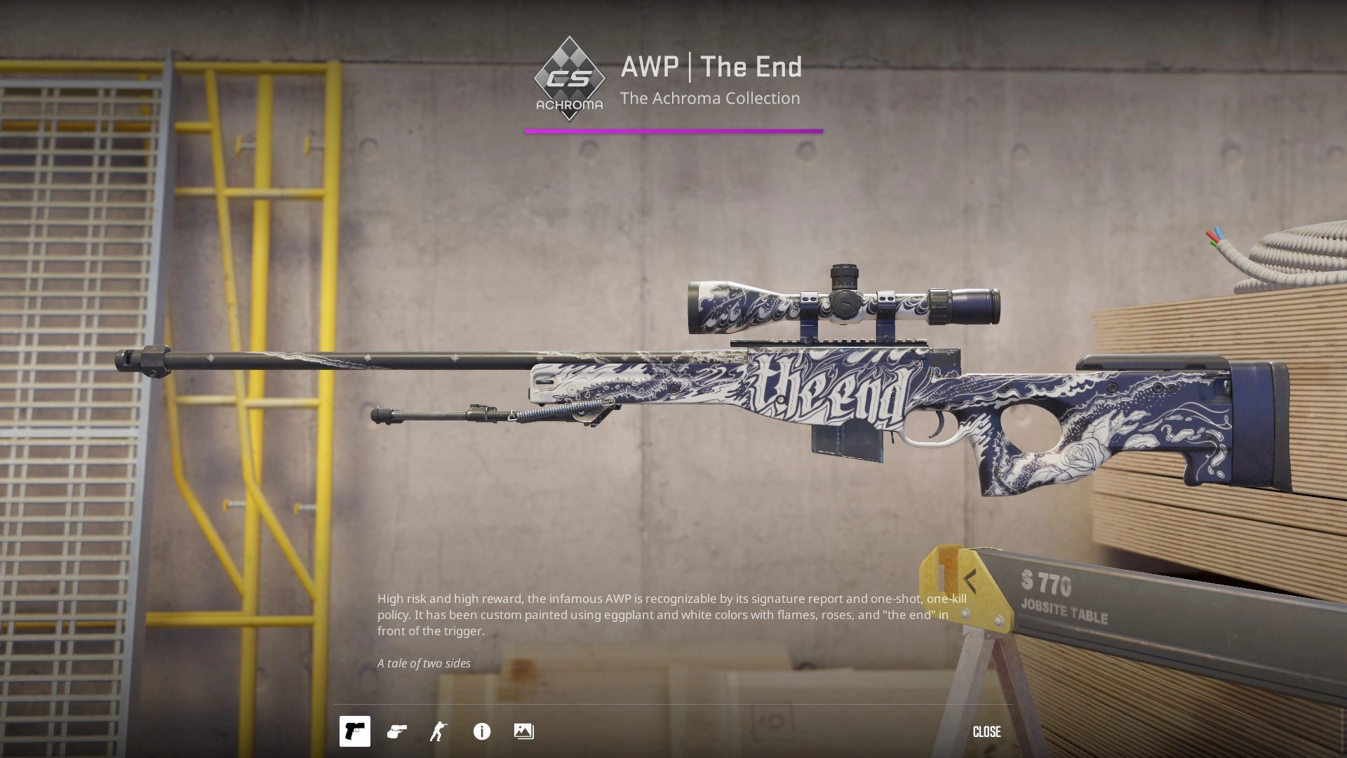 - AWP | The End (Achroma) – чёрно-белый апокалиптический дизайн, выглядит строго и элегантно.