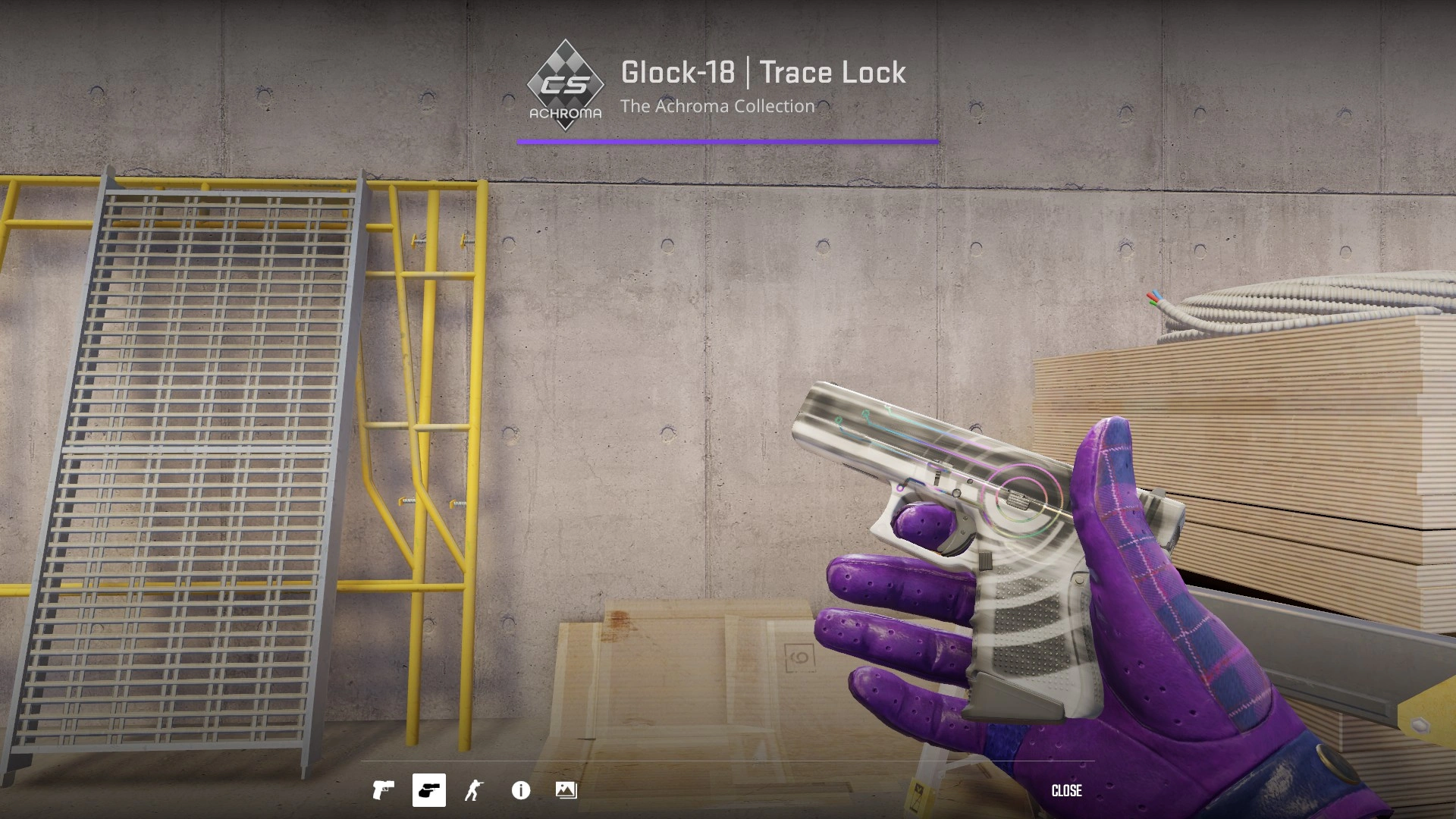 - Glock-18 | Trace Lock (Achroma) – для нас это безоговорочный топ-1 за счёт оригинальных голографических линий, выполненных в стиле имплантов Cyberpunk 2077.