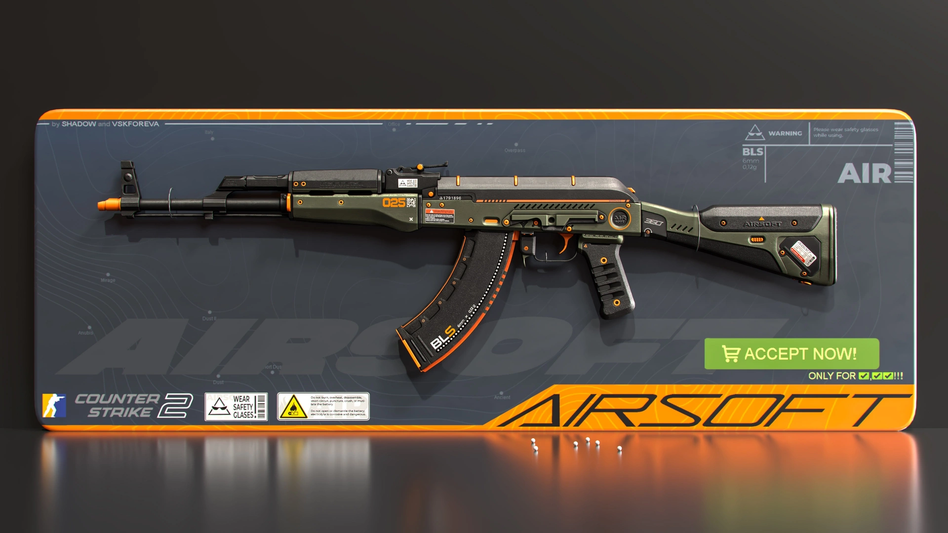 Стилизованный под страйкбольные реплики AK-47, этот скин выглядит как демонстрационный прототип из инженерной лаборатории. Матовые тёмно-оливковые панели сочетаются с яркими оранжевыми акцентами, болтами и техническими маркировками, создавая ощущение модульной и высокоточной конструкции. Прозрачный магазин с видимыми страйкбольными пулями усиливает отсылку к airsoft-тематике и подчёркивает концепцию тренировочного или экспериментального оружия. Airsoft Elite отлично вписывается в эстетику Spy Tech: сдержанный, технологичный и выверенный до мелочей дизайн без лишнего визуального шума.