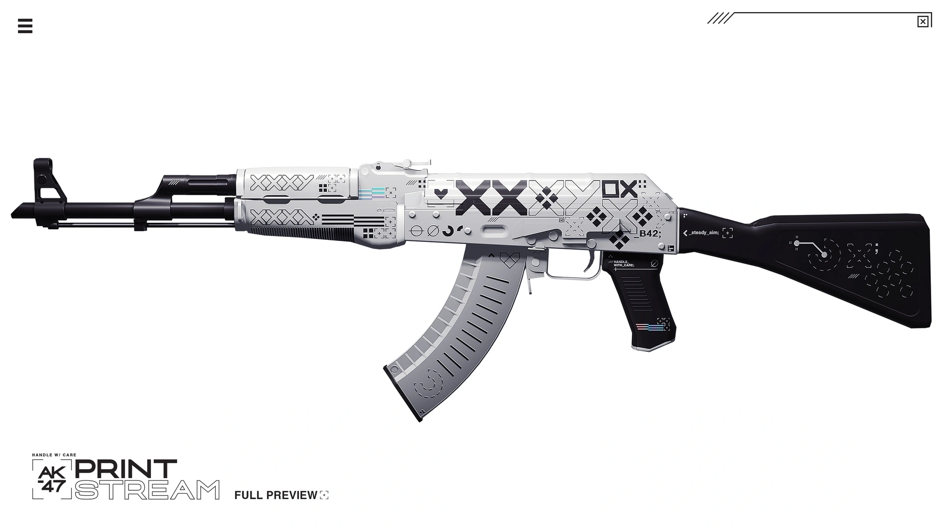Этот дизайн уже стал культовым для сообщества, а большая часть линейки Printstream давно присутствует в игре. Добавление AK-47 в коллекцию выглядит как логичный и давно ожидаемый шаг, а тематика Spy Tech идеально подчёркивает технологичную сущность одного из самых любимых скинов в CS. Контрастный чёрно-белый дизайн с глянцевым перламутровым эффектом построен на графических фигурах, крестах и прямоугольниках, создающих ощущение цифрового интерфейса. Пунктирные линии на прикладе напоминают ASCII-графику и отсылают к самому названию Printstream – термину из программирования, связанному с выводом данных.
