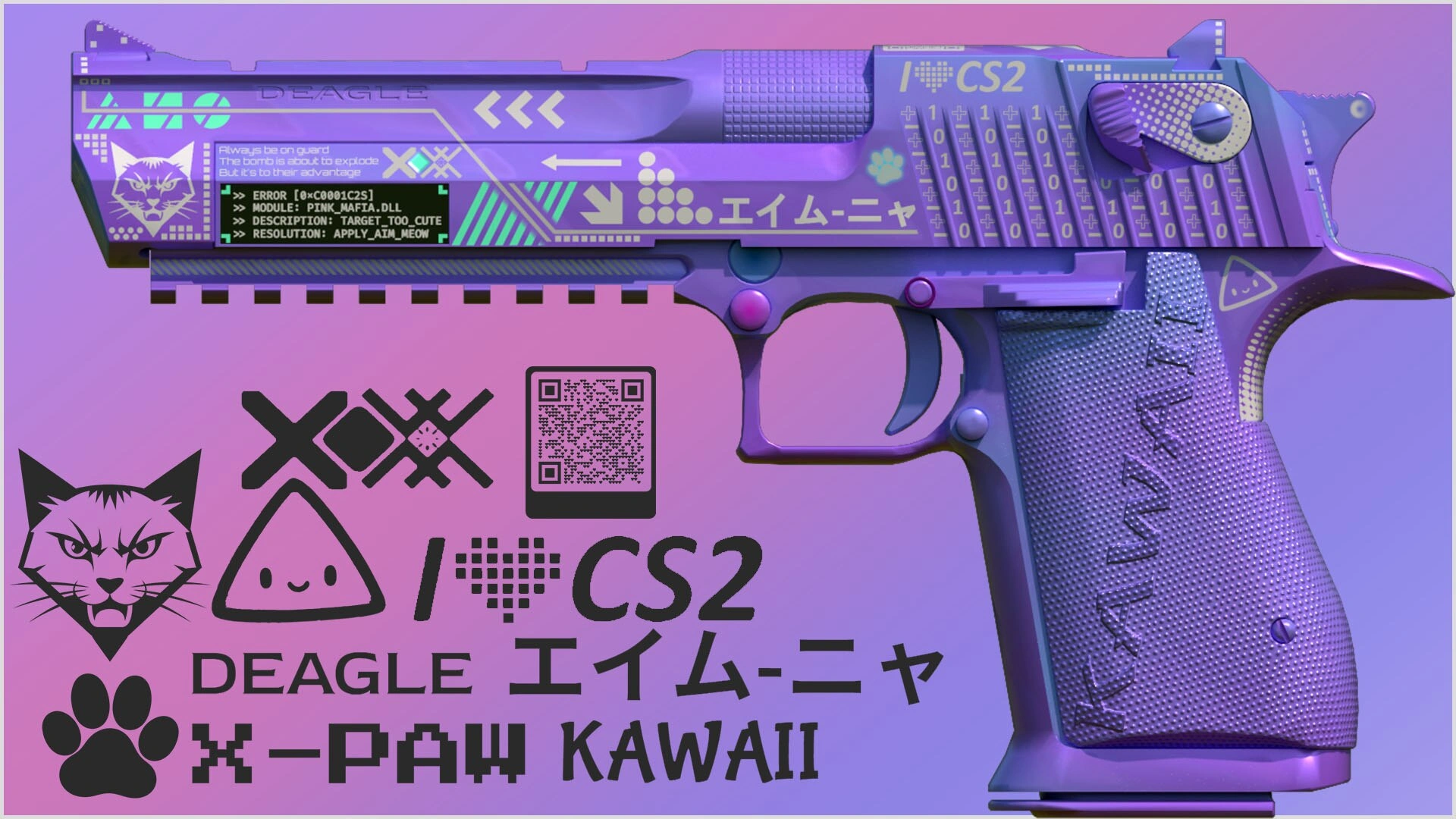 Яркий фиолетово-розовый градиент сочетается с цифровыми пиктограммами, бинарными строками, стрелками интерфейса и милыми символами в духе японской поп-культуры. На корпусе соседствуют коты, лапки, иконки и глитч-элементы, создавая ощущение хаотичного, но продуманного кибер-интерфейса. Covert Kawaii играет на контрасте между «милотой» и смертоносной мощью Desert Eagle, превращая пистолет в стильный Spy Tech-гаджет. Такой дизайн легко считывается в игре и выглядит как готовый хит для коллекции.