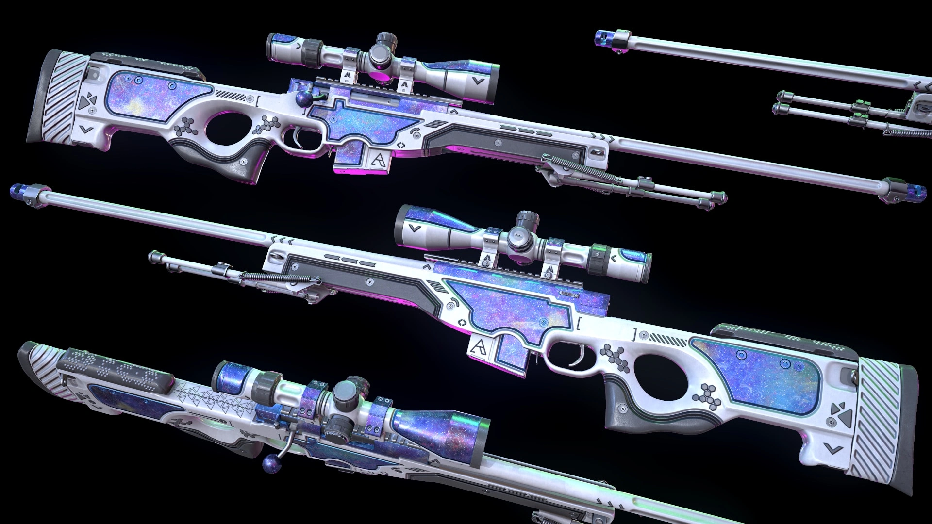 Футуристичный снайперский прототип с панелями, заполненными перламутровой текстурой туманности Андромеды. Глубокие сине-фиолетовые переливы выглядят как встроенные дисплеи или энергетические модули, заключённые в чистый бело-серый корпус. Несмотря на яркий эффект, дизайн остаётся аккуратным и цельным: светящиеся вставки органично вписаны в геометрию оружия и подчёркивают его высокотехнологичный характер. Andromeda ощущается как снайперская винтовка для дальних космических операций – эстетичный и продуманный представитель Spy Tech.